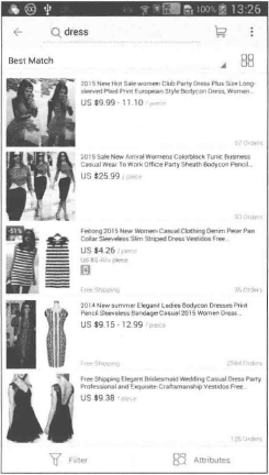 在無線端搜索“dress",搜索的結(jié)果是按照默認(rèn)的Best Match算法進(jìn)行排序,我們可以看到有手機(jī)專享價(jià)的圖片,從某種意義上而言,在這個(gè)搜索結(jié)果頁(yè)上設(shè)置了手機(jī)專享價(jià)的商品已經(jīng)獲得了較高的自然搜索曝光率。